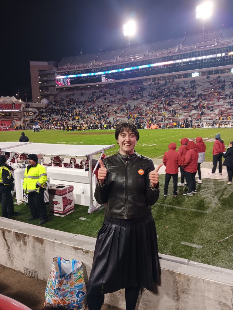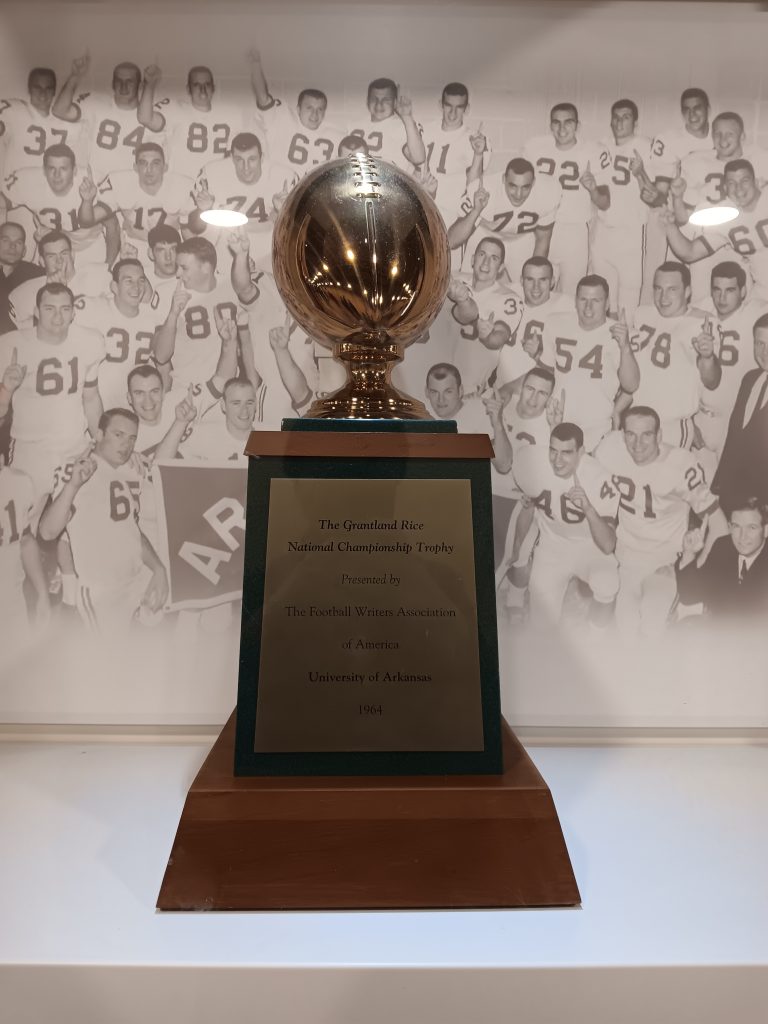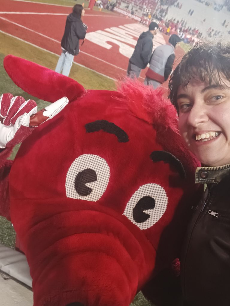 Although I arrived late and shivered the most of the way through the match thanks to the wretched 30F Arkansas weather, the realisation this was likely the last Razorbacks match I would see in person made me far more attentive than normal. I chatted with the screeching amateur defensive coordinators in the stands. I made sure to get my photograph taken with all four Razorback mascots – it came as a complete surprise that Pork Chop was one of my old students, but it was great to catch up Sarah Beth! – and Tusk VI, the live mascot’s most recent appointee. Staring down at a trophy from 1964, I realised just how long the team has shaped the lives of Arkansas’ inhabitants and really understood the weight of the tradition I briefly got to partake in.